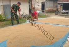 - Aksi Nyata di Sawah, Babinsa Sampang Serka Harianto Bantu Warga Jemur Padi di Taman Sareh