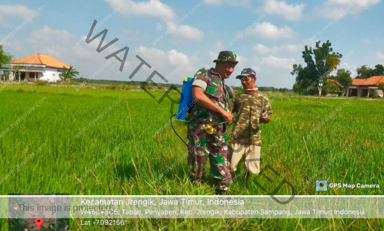 Jrengik, 29 Mei 2024 – Babinsa Koramil 0828/06 Jrengik, Serda Edi, kembali menunjukkan komitmennya dalam mendukung kesejahteraan petani dengan turun langsung membantu kegiatan penyemprotan hama dan gulma di area persawahan Desa Panyepen, Kecamatan Jrengik Sampang. Kegiatan ini merupakan bagian dari upaya TNI untuk mendukung ketahanan pangan nasional dan meningkatkan produktivitas pertanian di wilayah binaannya. Serda Edi bersama para petani bekerja sama melakukan penyemprotan di lahan seluas 10 hektar. Penyemprotan ini dilakukan untuk mengendalikan hama dan gulma yang dapat mengancam hasil panen para petani. Dengan peralatan semprot modern yang disediakan oleh Koramil Jrengik, proses penyemprotan dilakukan dengan cepat dan efisien.
