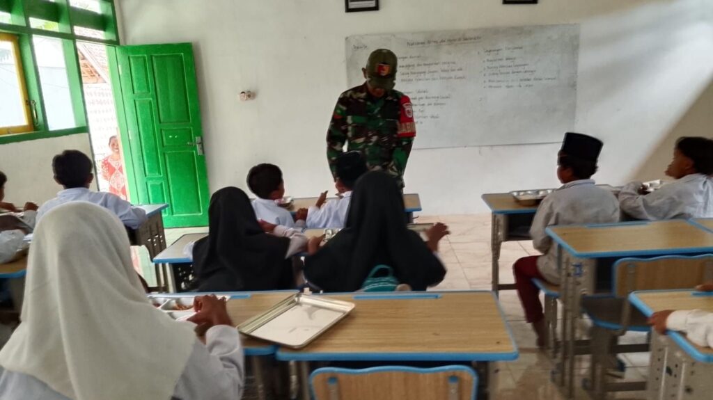 Sampang – Dalam upaya mendukung peningkatan gizi dan kesehatan anak usia sekolah, Babinsa Koramil 0828/02 Camplong, Kopda Hendrid, melaksanakan kegiatan pendampingan program Makan Bergizi Gratis (MBG) di SDN Madupat, Kecamatan Camplong, Kabupaten Sampang. Kegiatan ini merupakan bentuk kepedulian TNI terhadap generasi muda, khususnya dalam memastikan para siswa mendapatkan asupan gizi yang cukup untuk menunjang pertumbuhan dan proses belajar mereka di sekolah. Dalam pelaksanaannya, Kopda Hendrid turut membantu proses pendistribusian makanan serta memastikan kegiatan berjalan tertib dan lancar.