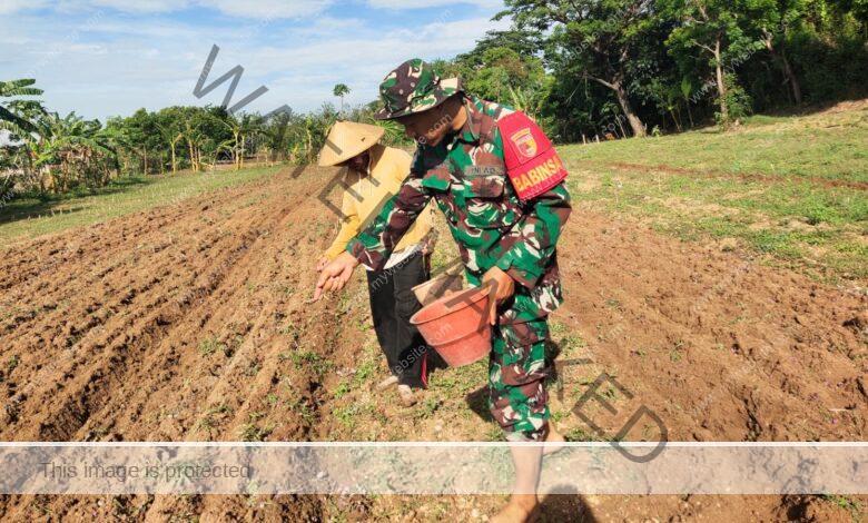 Sampang – Babinsa Pos Ramil 0828/13 Pangarengan, Serka Lery Ismanto, melaksanakan kegiatan gotong royong bersama petani di Dusun Rabesen, Desa Gulbung, Kecamatan Pangarengan, Sampang. Kegiatan ini dilakukan dengan membantu menanam bibit jagung untuk mendukung peningkatan produksi pertanian di wilayah tersebut.