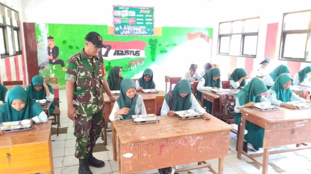 Sampang – Babinsa Koramil 0828/12 Robatal, Serda Yeka, melaksanakan kegiatan pendampingan dalam pendistribusian Makan Bergizi Gratis (MBG) kepada para siswa di salah satu sekolah dasar yang berada di Desa Pandiyangan, Kecamatan Robatal, Kabupaten Sampang. Kegiatan pendampingan ini dilakukan sebagai bentuk dukungan TNI AD terhadap program pemerintah dalam meningkatkan gizi dan kesehatan anak sekolah. Serda Yeka turut membantu memastikan penyaluran makanan berjalan tertib, tepat sasaran, serta memenuhi standar kebersihan.