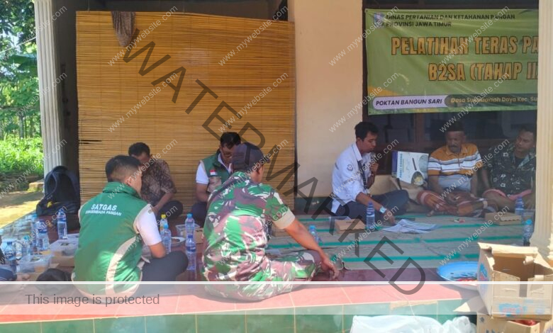 Sampang – Babinsa Koramil 0828/08 Sokobanah, Sertu Agus Sumartono, melaksanakan pendampingan kegiatan pelatihan Teras Pangan B2SA (Beragam, Bergizi, Seimbang, dan Aman) Tahap II bersama kelompok tani dan warga di Desa Sokobanah Daya, Kecamatan Sokobanah, Kabupaten Sampang. Kegiatan ini bertujuan untuk mendorong kemandirian pangan masyarakat desa melalui pemanfaatan lahan pekarangan sebagai sumber pangan alternatif. Dalam pelatihan tersebut, peserta mendapatkan materi terkait teknik budidaya tanaman hortikultura, pemanfaatan limbah organik sebagai pupuk, serta pola konsumsi pangan B2SA guna memenuhi gizi keluarga.
