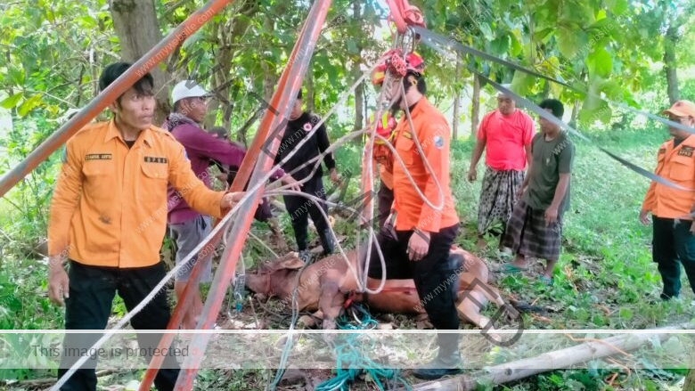 Peristiwa tersebut terjadi sekitar pukul 06.00 WIB. Sapi milik Soleh (56) diketahui jatuh ke dalam sumur setelah sebelumnya dilaporkan hilang.