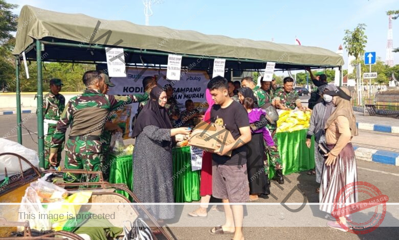 Sampang – Dalam upaya menjaga stabilitas harga pangan serta mendukung ketahanan pangan masyarakat, Kodim 0828/Sampang bekerja sama dengan Perum Bulog menggelar Gerakan Pangan Murah di Alun-Alun Trunojoyo, Kecamatan Sampang, Kabupaten Sampang. Kegiatan ini menjadi daya tarik tersendiri bagi masyarakat. Ribuan warga tampak antusias memadati area alun-alun sejak pagi hari demi mendapatkan beras SPHP (Stabilisasi Pasokan dan Harga Pangan) dengan harga terjangkau namun tetap berkualitas.