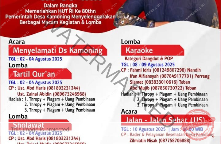 SAMPANG – Dalam rangka menyambut Hari Ulang Tahun (HUT) ke-80 Kemerdekaan Republik Indonesia, Pemerintah Desa Kamoning, Kecamatan Sampang, tengah menyiapkan serangkaian kegiatan bertajuk “Semarak Kemerdekaan Republik Indonesia ke-80”.