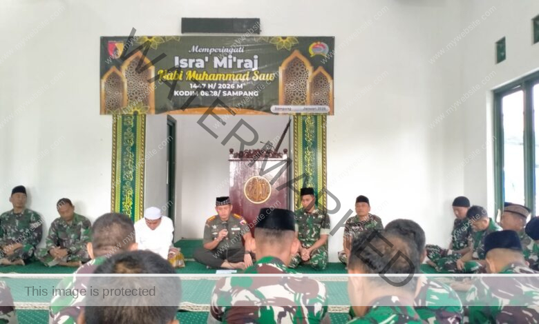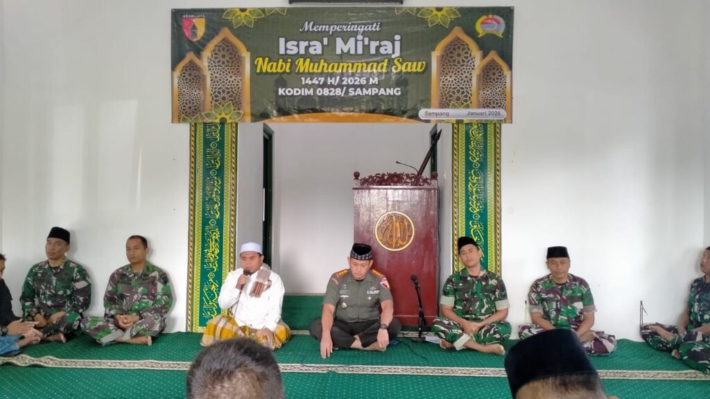 Sampang – Dalam rangka memperingati peristiwa Isra Mi’raj Nabi Muhammad S.A.W 1447 H/2026 M, Komando Distrik Militer (Kodim) 0828/Sampang menggelar acara yang diadakan di Masjid Al-Ikhlas Makodim Sampang. Peringatan ini dihadiri oleh seluruh anggota Kodim Sampang, serta para prajurit dan keluarga besar TNI yang tergabung dalam wilayah teritorial Kodim Sampang. Acara dimulai dengan pembacaan ayat suci Al-Qur’an, dilanjutkan dengan sambutan oleh Dandim 0828/Sampang Letkol Czi Dika Catur Yanuar Anwar S.T, Dalam sambutannya, Dandim “menyampaikan pentingnya peringatan Isra Mi’raj sebagai momen refleksi untuk meningkatkan keimanan dan ketakwaan kepada Allah SWT, serta mengingatkan kembali tentang nilai-nilai spiritual yang dapat diterapkan dalam kehidupan sehari-hari, baik di lingkungan militer maupun masyarakat.