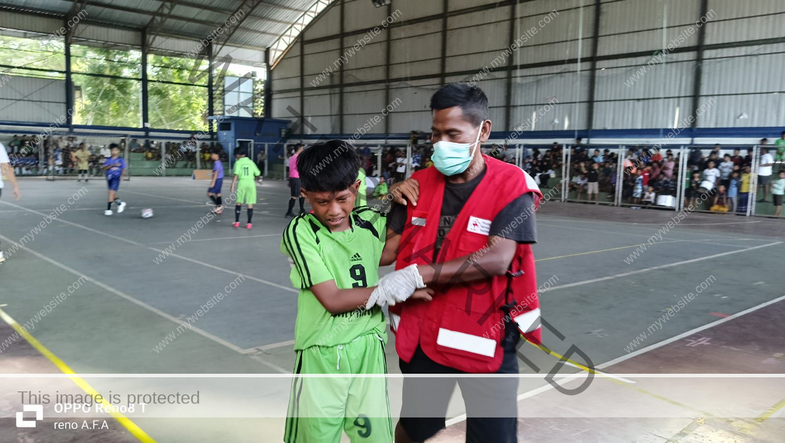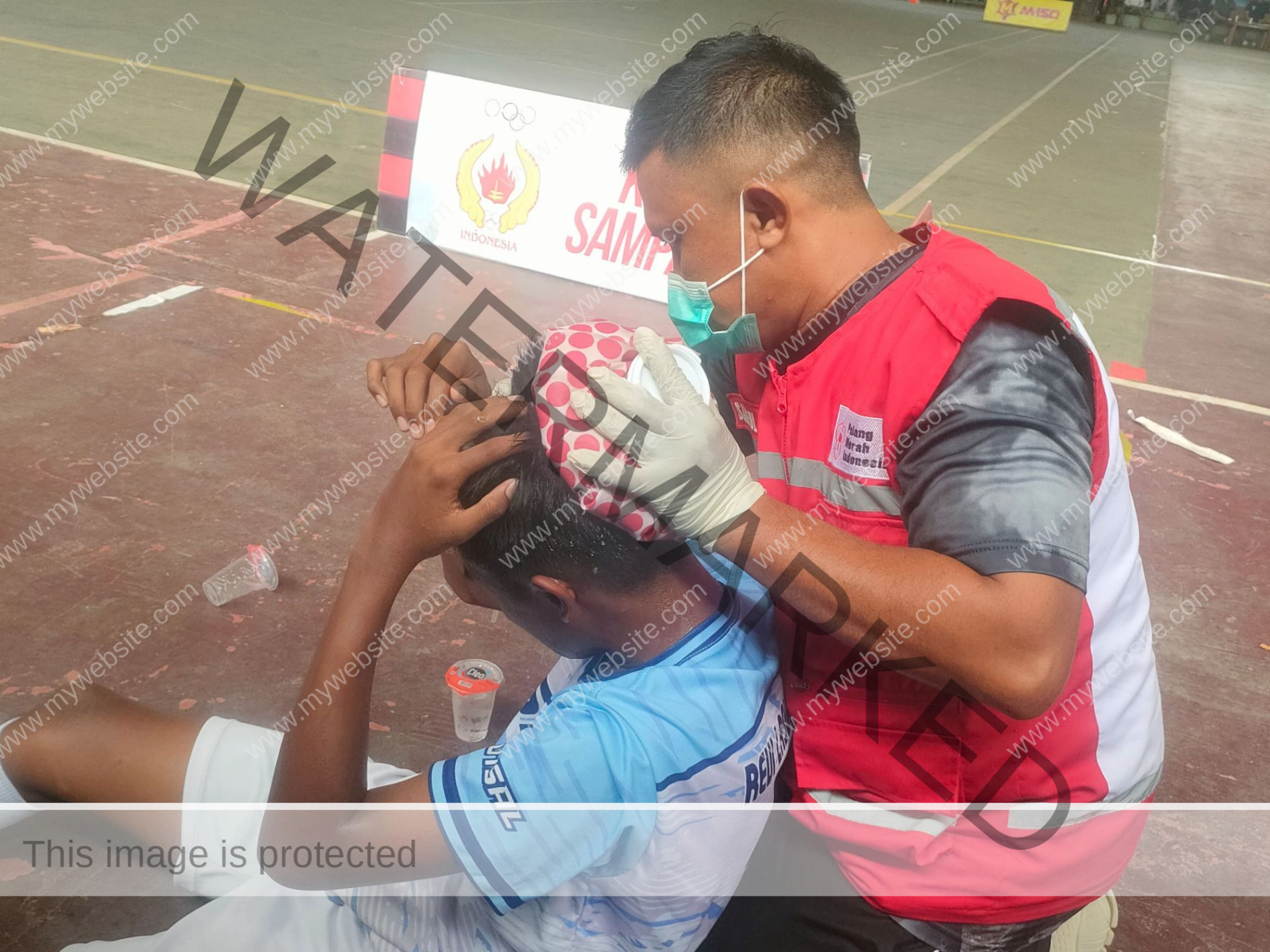 Personel Tim Kesehatan PMI dengan cepat memberikan pertolongan pertama kepada pemain yang mengalami kram otot, terkilir, dan luka lecet akibat benturan saat pertandingan berlangsung.