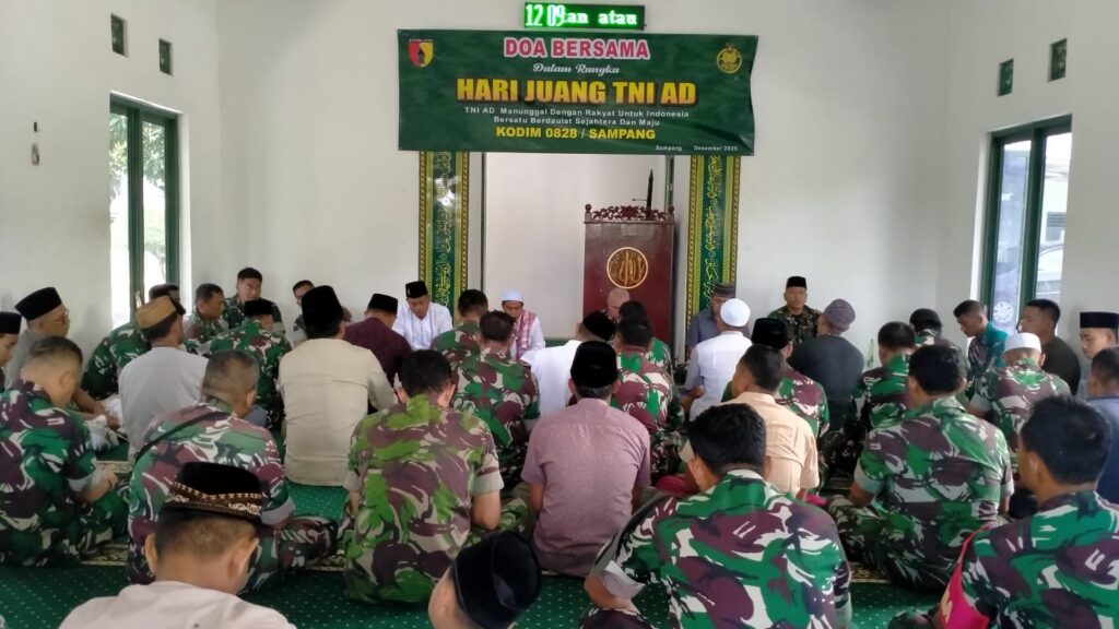 Sampang, 12 Desember 2025 – Dalam rangka memperingati Hari Juang TNI Angkatan Darat (TNI-AD) yang ke-80 Tahun 2025 Kodim 0828/Sampang menggelar acara doa bersama di Masjid Al-Ikhlas Makodim Sampang pada. Acara ini dihadiri oleh seluruh personel Kodim 0828/Sampang, mulai dari perwira, prajurit, staf, hingga keluarga besar TNI yang bertugas di wilayah Kabupaten Sampang. Kegiatan doa bersama ini bertujuan untuk memanjatkan doa kepada Tuhan Yang Maha Esa, agar senantiasa memberikan keselamatan, kekuatan, dan kemudahan bagi seluruh prajurit TNI, serta mendukung TNI dalam menjaga kedaulatan Negara Kesatuan Republik Indonesia (NKRI). Selain itu, doa bersama juga dimaksudkan untuk mendoakan para pahlawan yang telah gugur dalam memperjuangkan kemerdekaan dan ketahanan bangsa.