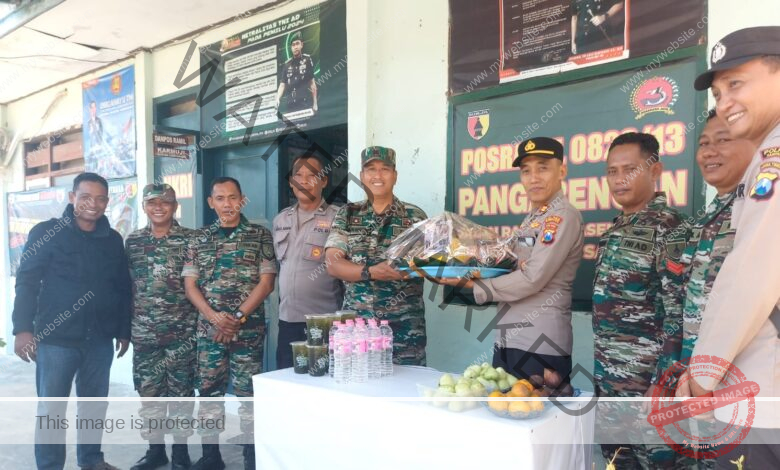 Pangarengan — Dalam semangat kebersamaan dan sinergi TNI–Polri, Komandan Pos Ramil 0828/13 Pangarengan, Peltu Karmuji, bersama anggota menerima tumpeng ucapan HUT TNI ke-80 dari Kapolsek Pangarengan, Iptu Suhadi, beserta jajaran, di Kantor Posramil 0828/13 Pangarengan, Desa Apaan, Kecamatan Pangarengan, Kabupaten Sampang. Penyerahan tumpeng ini merupakan bentuk apresiasi dan simbol keharmonisan antara Polri dan TNI yang selama ini telah terjalin erat dalam menjaga keamanan dan ketertiban masyarakat di wilayah Pangarengan.