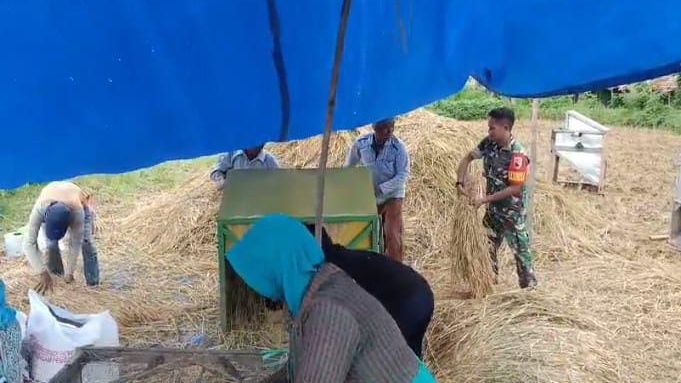 Babinsa Posramil Pangarengan di Tengah Sawah, Bantu Petani Panen Padi di Dusun Talonan